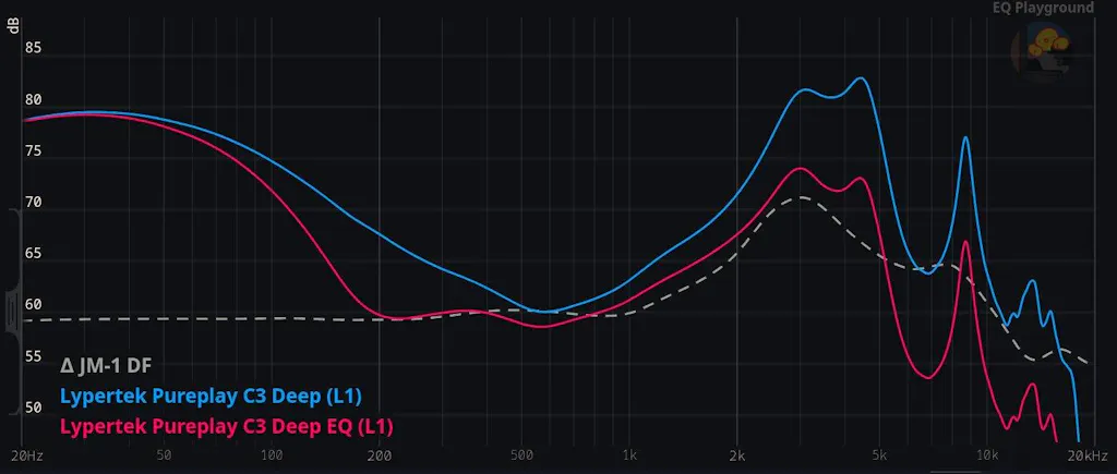 Blue is default with silicone tips, Red is EQed, and dotted line is neutral.